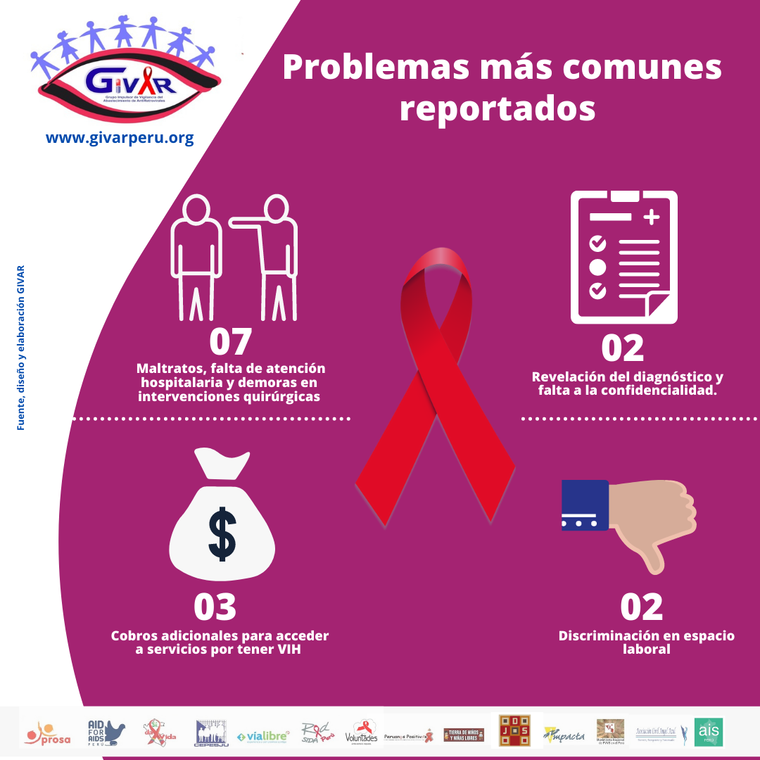 Durante los dos últimos años de la pandemia por Covid-19, GIVAR registró reportes históricos de consultas, quejas y denuncias por problemas de la atención en salud, desabastecimiento de medicamentos e insumos para el tratamiento o prevención del VIH y situaciones de discriminación.Aquí les mostramos nuestro reporte del 2021, en donde recibimos 329 casos de personas con VIH que recurrieron ante nuestro colectivo, por haber sido vulnerado su derecho a la salud. Las quejas fueron derivadas a los responsables de los programas de VIH del Ministerio de Salud, EsSalud y ONG para su solución, además muchas fueron reportadas a la Defensoría del Pueblo, Superintendencia Nacional de Salud (SUSALUD) y la Superintendencia de Fiscalización Laboral (SUNAFIL). El Ministerio de Salud, es el más quejado con 205 casos, 77 en EsSalud y 30 usuarios que reciben tratamiento en organizaciones no gubernamentales.Aquí el detalle de nuestro #InformeVIH2021